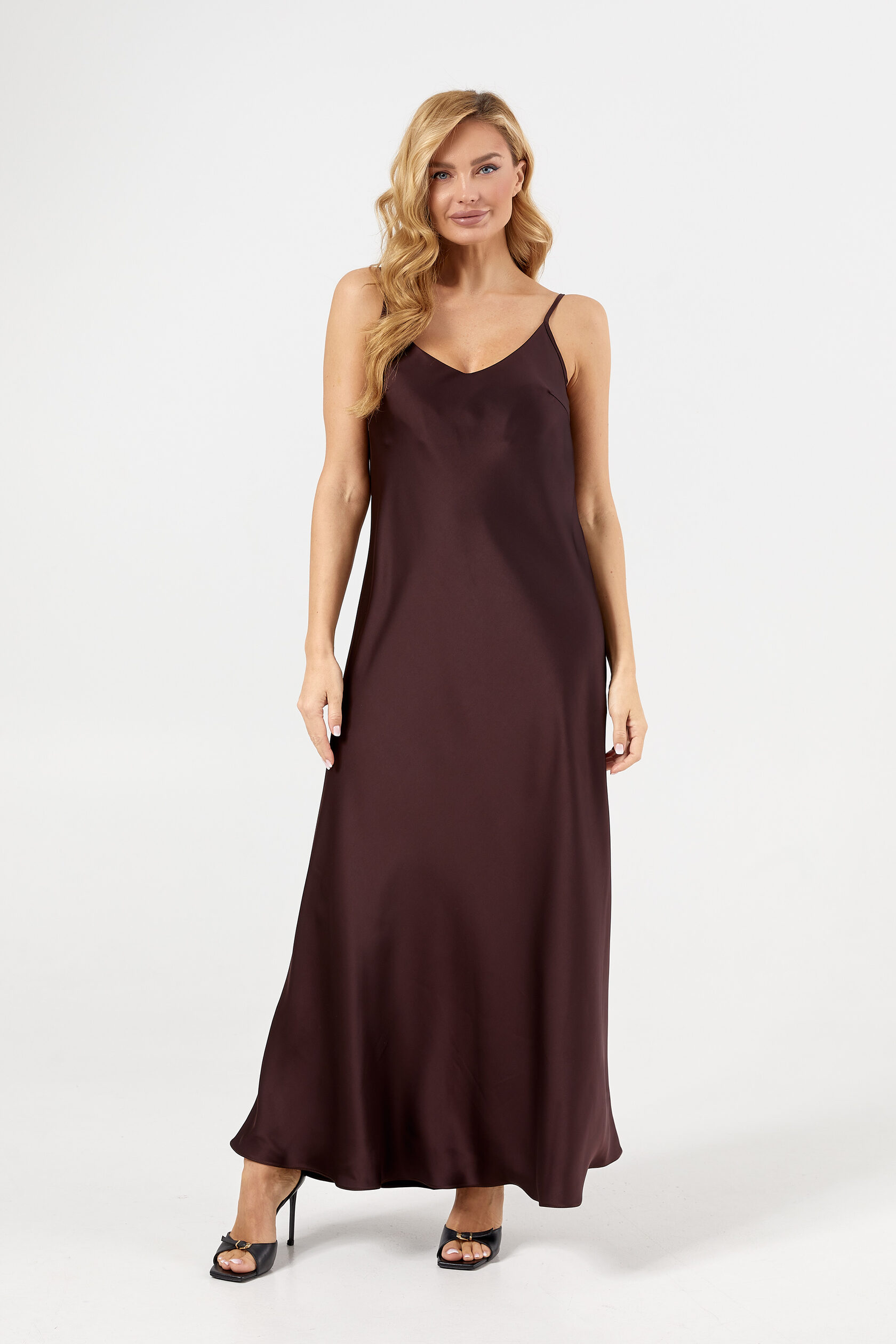 Склад: бавовна - 31 % віскоза - 67 % еластан - 2 % Стильна довга сукня на брительках у піжамному стилі виконана з щільної тканини, що нагадує шовк. Модель ніжно обтікає фігуру, приховує недоліки та підкреслює жіночність. Лаконічний дизайн робить сукню універсальною: її можна поєднувати з блузою, светром або топом, легко трансформуючи образ від casual до офісного чи вечірнього. Сукня поєднує комфорт, стиль і витонченість в одному виробі, ставши базовим елементом гардеробу для будь-яких подій.